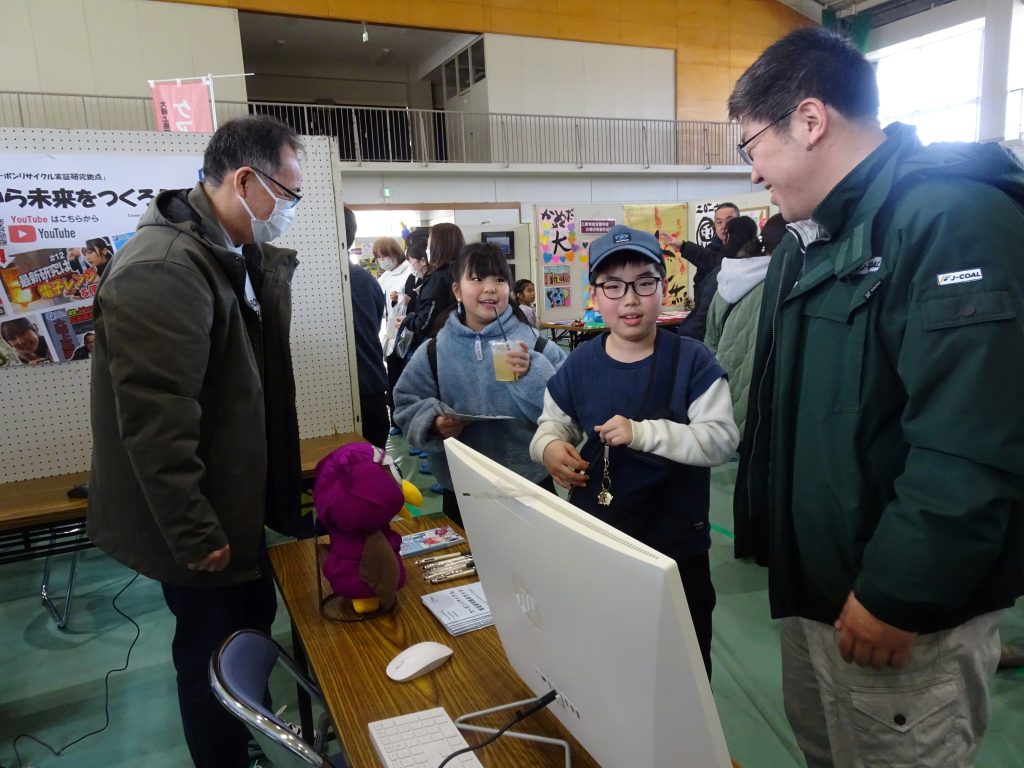 ブースでは、実証研究拠点を紹介するビデオやパネルを展示し、来客者には、本拠点概要をわかる小冊子やノベルティグッズを配布しました。年配の方が中心ではありましたが、小学生・中学生・島内出身の大学生も来ていただき、「島内でこんなことをしているなんて知らなかったし、驚いた」、「環境問題の解決に向けて実際に取り組んでおられる方や施設があることに感心した」との言葉を頂き、興味を持って説明を聞いてくださいました。
